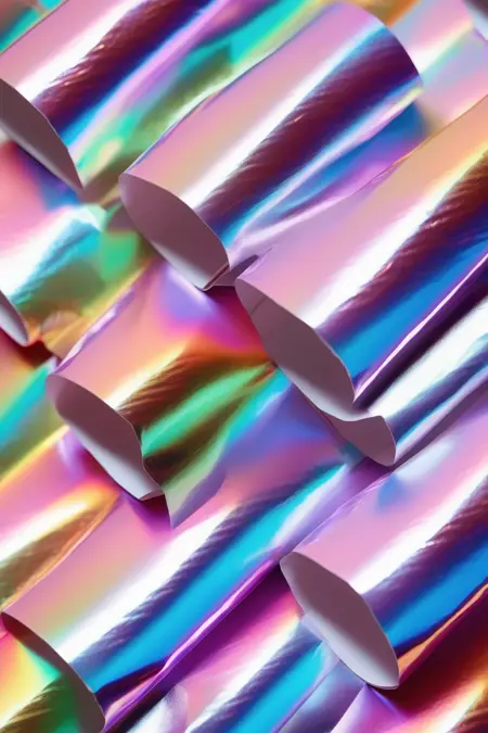 Iridescent foil is made by combining layers of thin, translucent materials that reflect and refract light differently. As light hits the surface of the foil, it undergoes interference and diffraction, resulting in a display of vibrant, rainbow-like colors that shift and change as the viewing angle or lighting conditions vary.