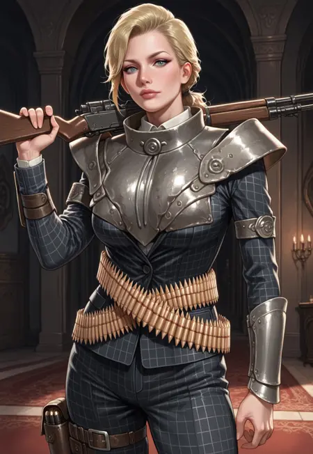 - breastplate, pauldrons, armlets, single vambrace, black checkered suit, ammunition belt, thigh holster, shoes,