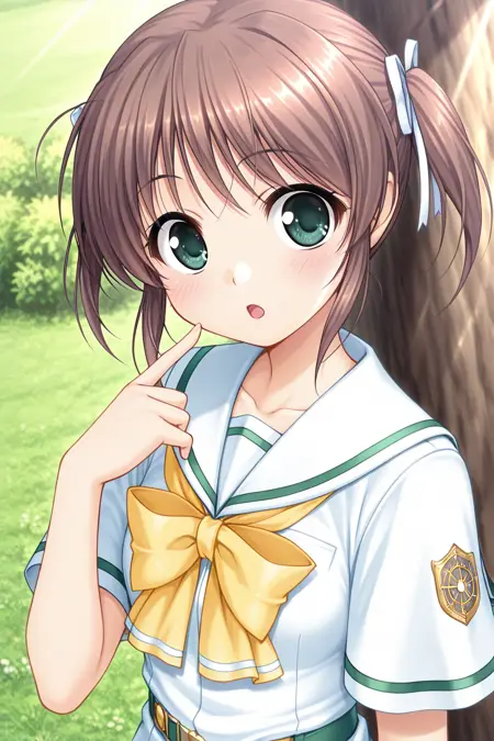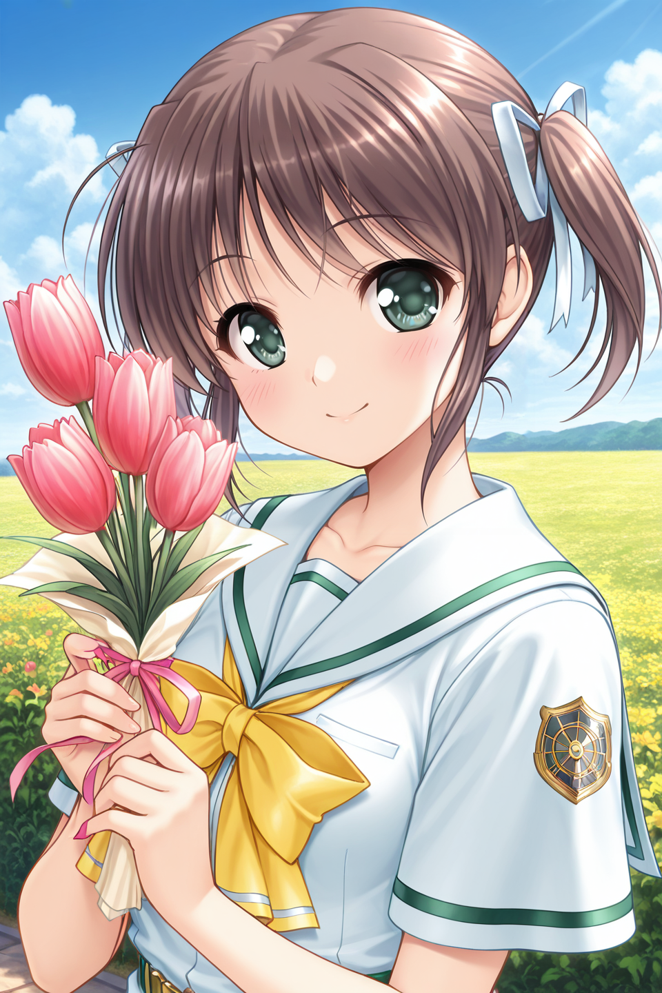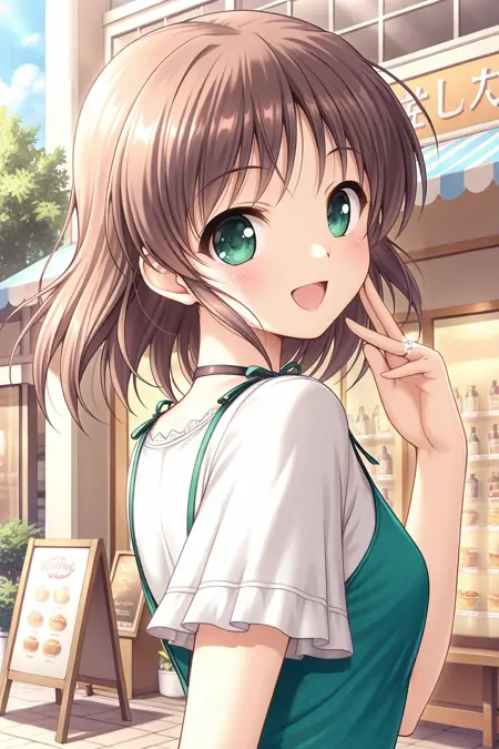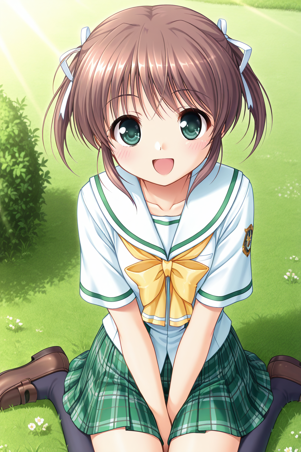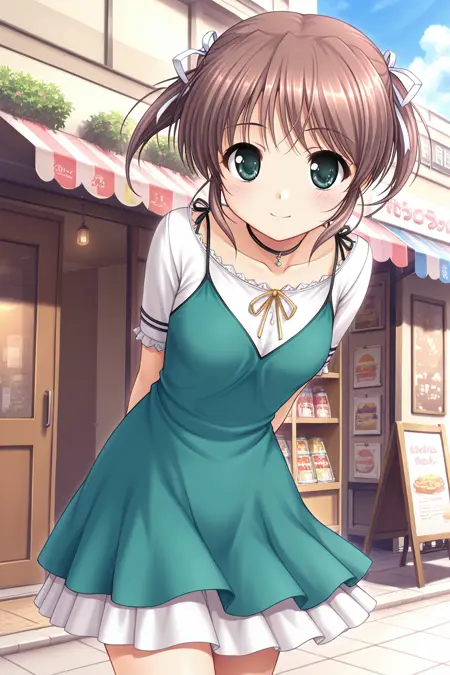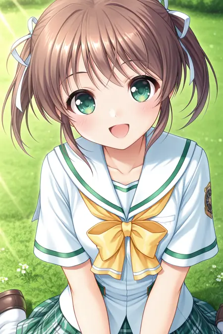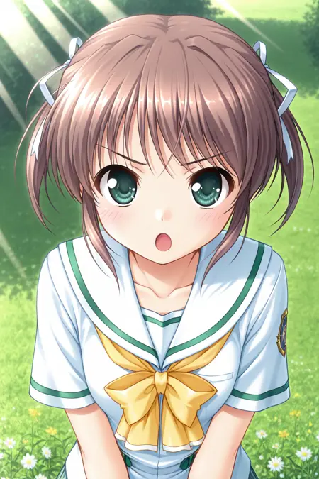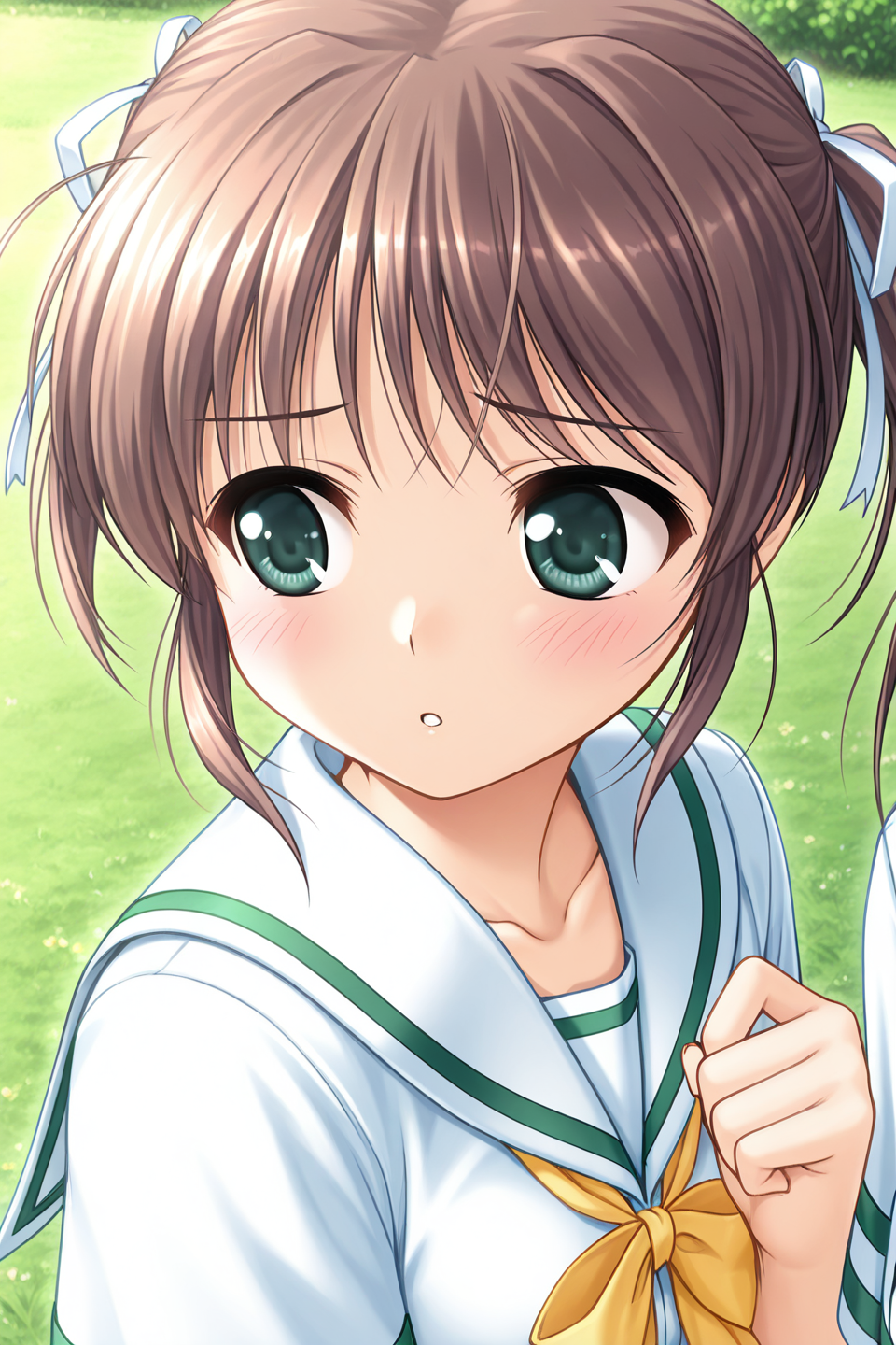 asagiri mai, green eyes, brown hair, short hair, short twintails, bangs, sidelocks, hair ribbon, white ribbon,