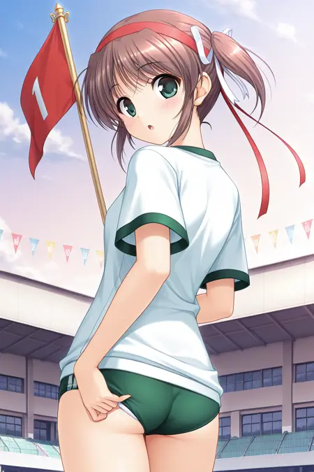 gym uniform, red headband, hachimaki, collarbone, t-shirt, white shirt, short sleeves, green buruma,