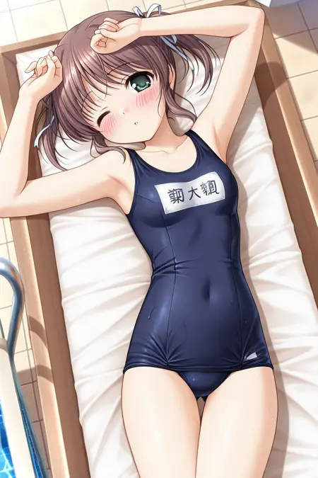 school swimsuit, old school swimsuit, blue one-piece swimsuit, name tag, character name, collarbone, kanji, bare shoulders,