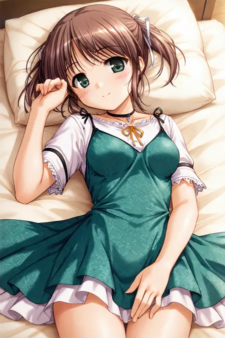 asagiri mai, green eyes, brown hair, short hair, short twintails, bangs, sidelocks, hair ribbon, white ribbon,
