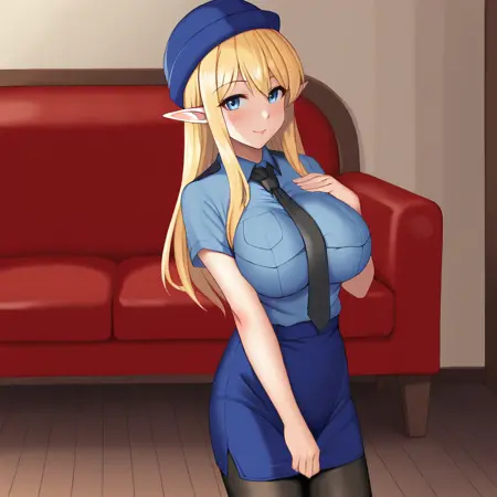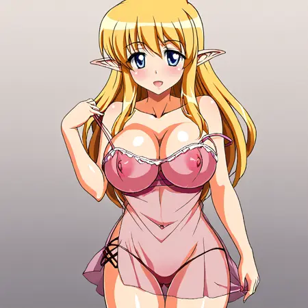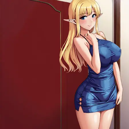 트리거: Tiffania, 1girl, 뾰족한 귀, 금발 머리, 긴 머리, 허벅지까지 오는 양말, 파란 눈, 엘프, 결혼용 장갑, 하이넥, 가슴, 절대 영역, 서 있는 자세,