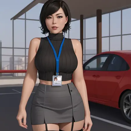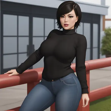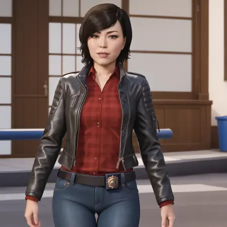 • 触发词:YuriWatanabePS4, 1girl, 皮夹克, 牛仔裤, 裤子, 红色T恤, 短发, 黑发, 皮带, 嘴唇, 格子图案, 开襟夹克