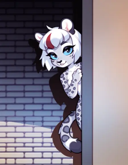Promt: Uma, solo, snow leopard, short white hair, red bangs, black nose, gray fur, pink shorts, black crop top, black eyes, blue sclera, bare neck.