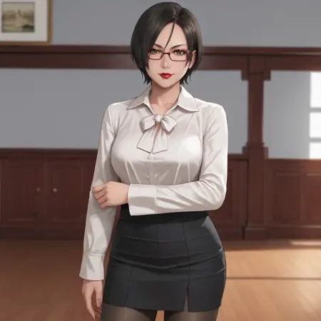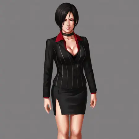 Trigger : AdaResidentEvilMovie, 1girl, short hair, choker, black hair, pencil skirt, brown eyes, collar, breasts, hair over one eye, formal, cleavage, suit,