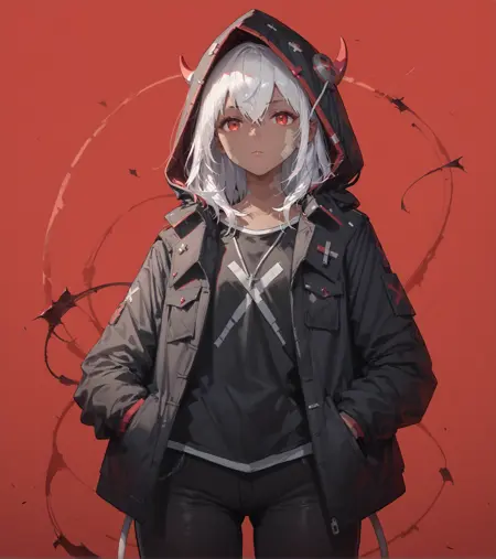 Ivy,深色皮肤,白发,头发遮住眼睛,刘海,红眼睛,黑色夹克,带帽夹克,帽子拉起,角,创可贴,黑色衬衫,黑色牛仔裤