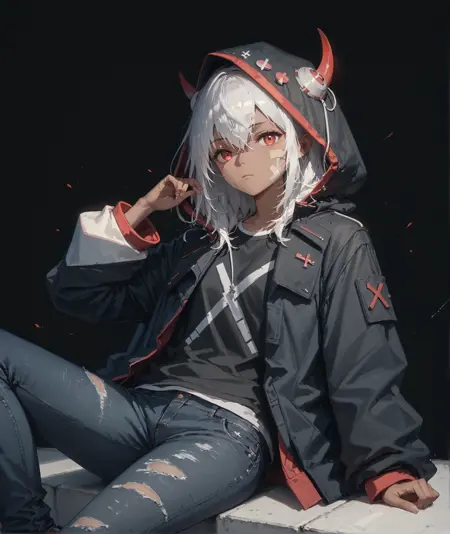 black jacket, hooded jacket, hood up, horns, bandaid, black shirt, black jeans