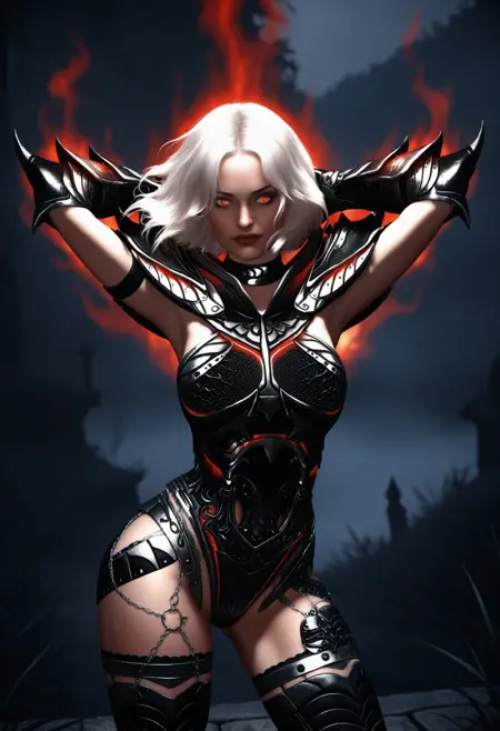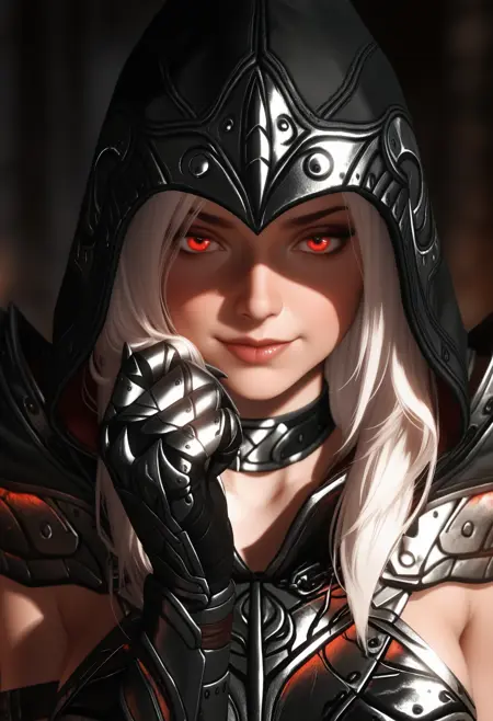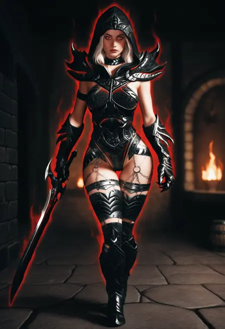Primary: d4rkr34p3r, armor:pauldrons, hood, choker, gauntlets, chain:thighhighs, half-skirt, high heel boots,
