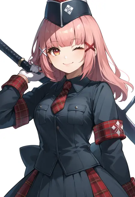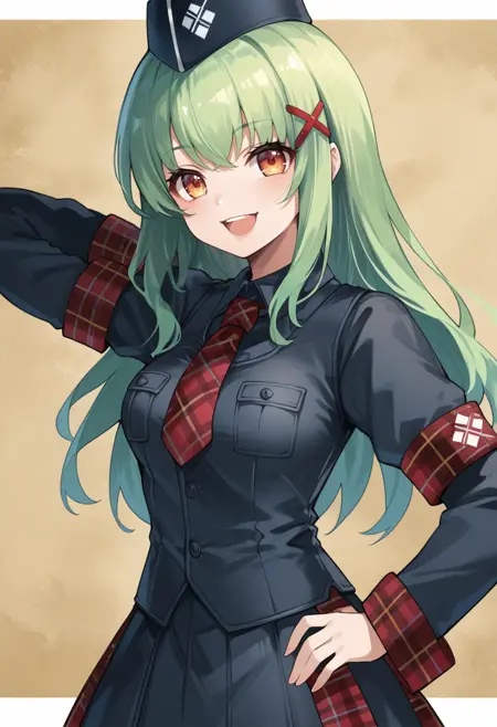 标签(服装):治疗者U护甲、黑色长靴、红色领带、黑色军帽、X形发饰、白色手套、黑色衬衫,