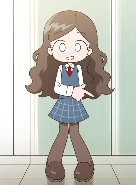 아이돌: 1dol, 갈색 머리, 긴 머리, 곱슬머리, 학교 uniform, 긴 소매, 칼라 셔츠, 빨간 넥타이, 파란색 치마, 분홍색 신발