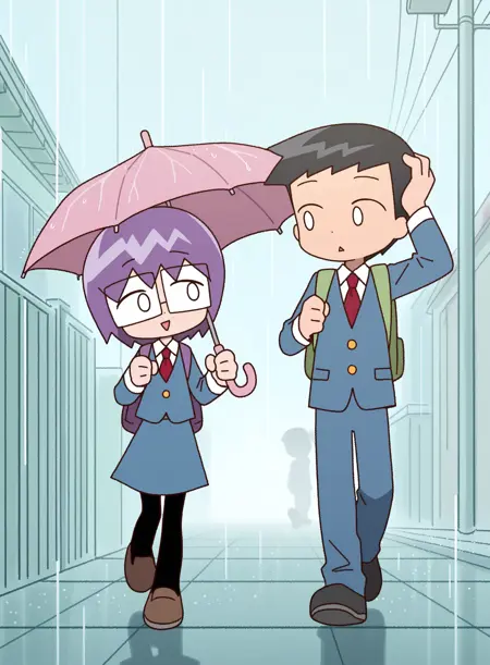 그 남자: h1m, 검은색 머리, 매우 짧은 머리, 학교 uniform, 파란색 재킷, 칼라 셔츠, 빨간 넥타이, 파란색 바지, 검은색 신발