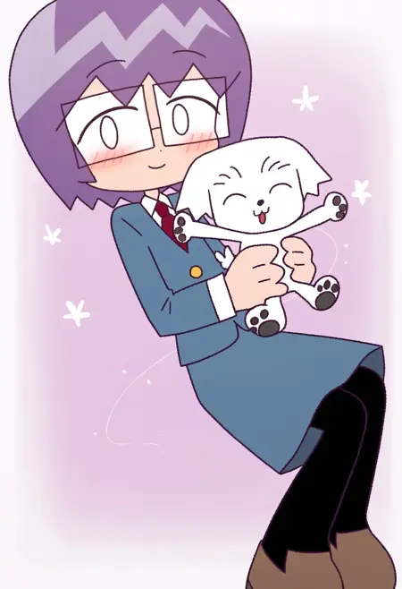 Sophie: s0phie, purple hair, partially opaque glasses, short hair, school uniform, blue jacket, collared shirt, red necktie, blue skirt, black pantyhose, brown footwear