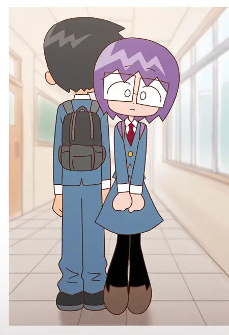 Him: h1m, black hair, very short hair, school uniform, blue jacket, collared shirt, red necktie, blue pants, black footwear