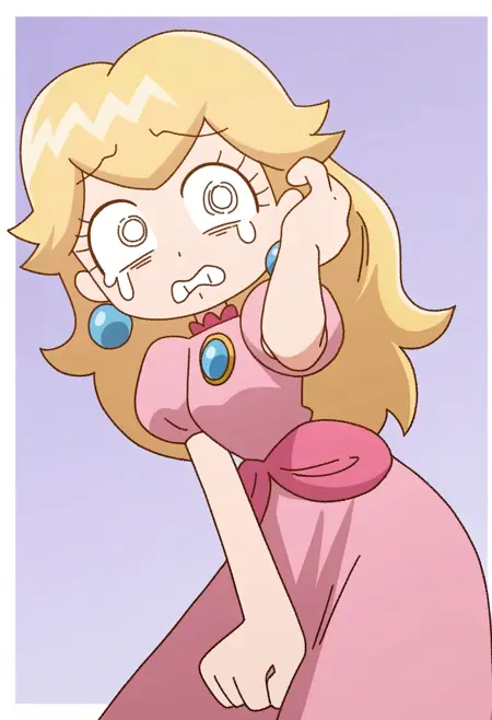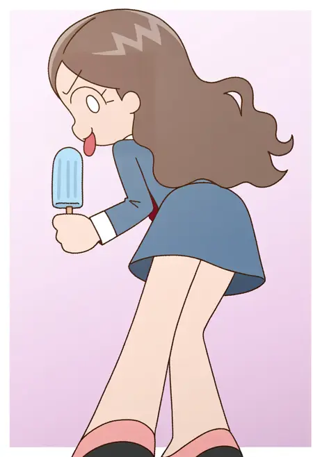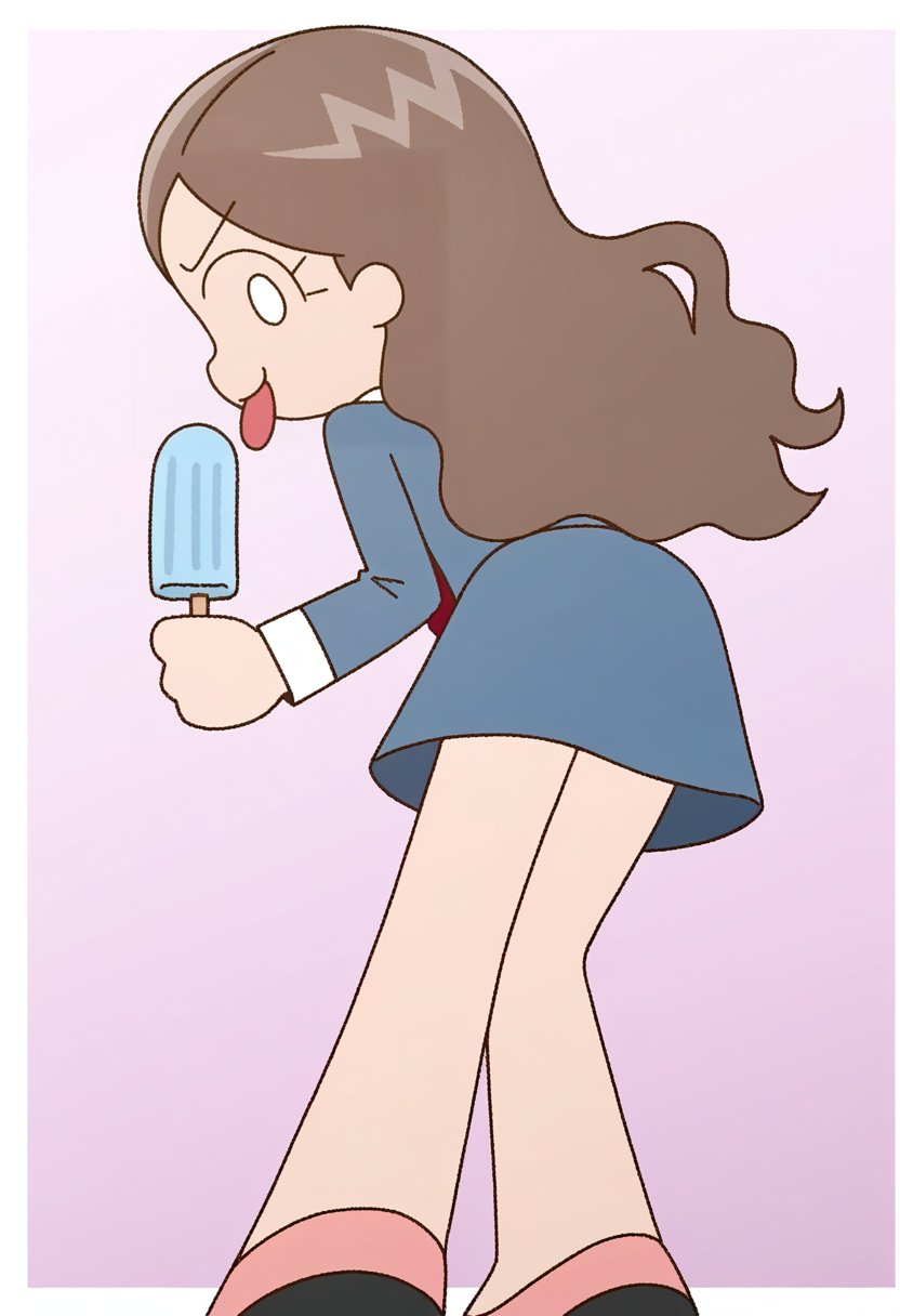 Idol: 1dol, brown hair, long hair, wavy hair, school uniform, long sleeves, collared shirt, red necktie, blue skirt, pink footwear