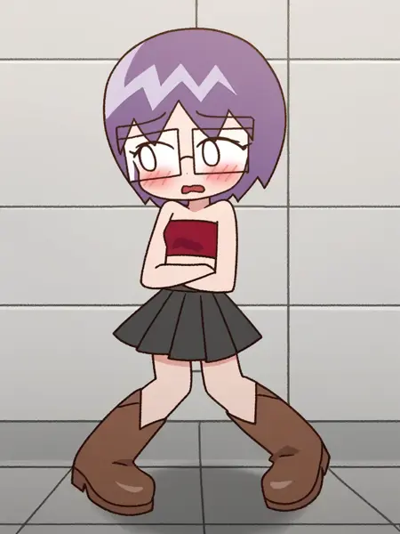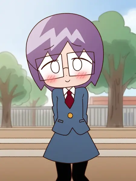 Sophie: s0phie, purple hair, partially opaque glasses, short hair, school uniform, blue jacket, collared shirt, red necktie, blue skirt, black pantyhose, brown footwear