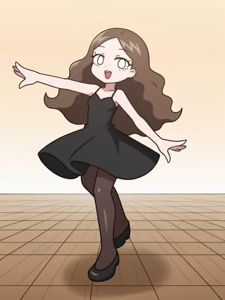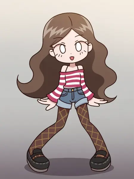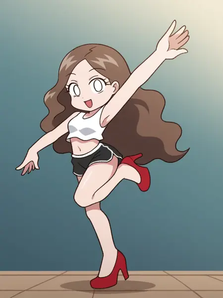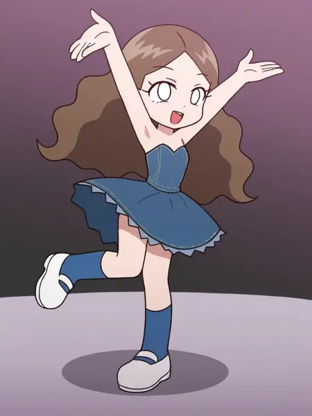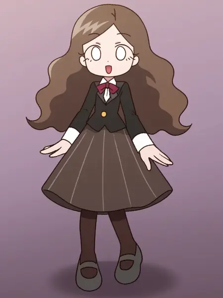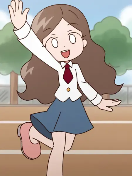 Idol: 1dol, brown hair, long hair, wavy hair, school uniform, long sleeves, collared shirt, red necktie, blue skirt, pink footwear