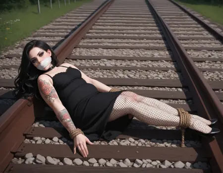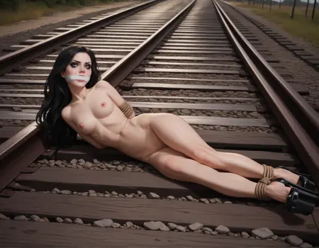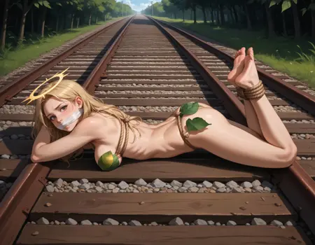 キーワード: hud_tr4cksb0und、口封じ、ロープ、縛られ、BDSM、横たわる、全身、束縛、屋外、鉄道レール、列車、横から