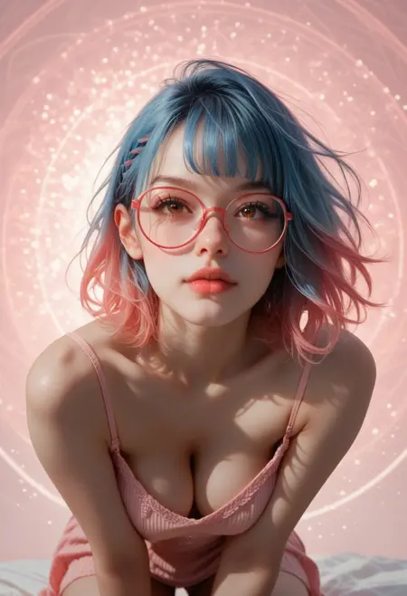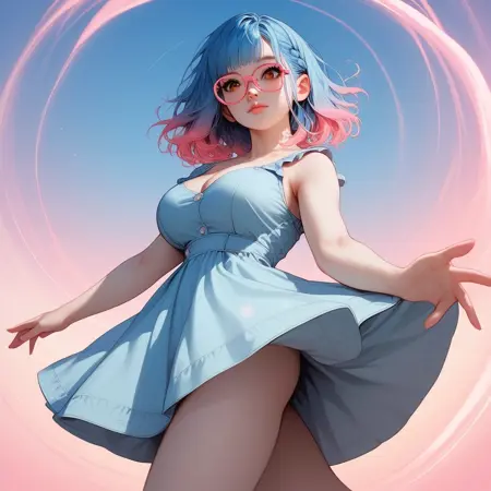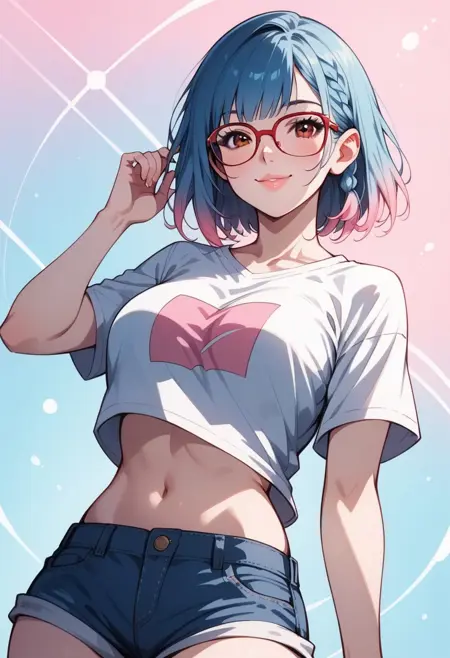cute face, medium hair, side braid, blue hair, pink gradient hair, brown eyes, detailed eyes, large breasts, curvy, pale skin, big squared eyeglasses, red framed eyeglasses, clear eyeglasses lens
