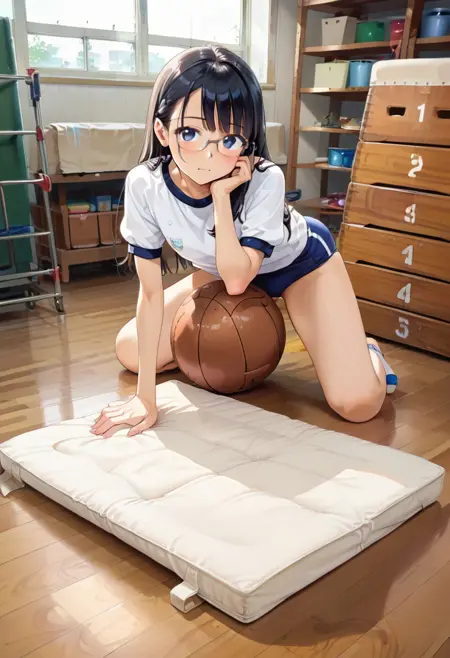 taikusouko, vaulting box, gymnastics mat, scenery, wooden floor, window, shelf, box, ball, sunlight, day, basketball, gym storeroom, indoors,