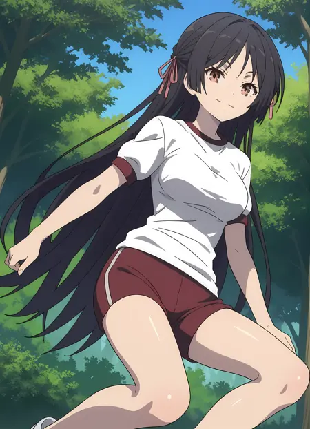 外見 → ohwx, black_hair, long_hair, 1girl, solo, brown_eyes, breasts, hair_ribbon, ribbon, medium_breasts, very_long_hair, large_breasts, half_updo,