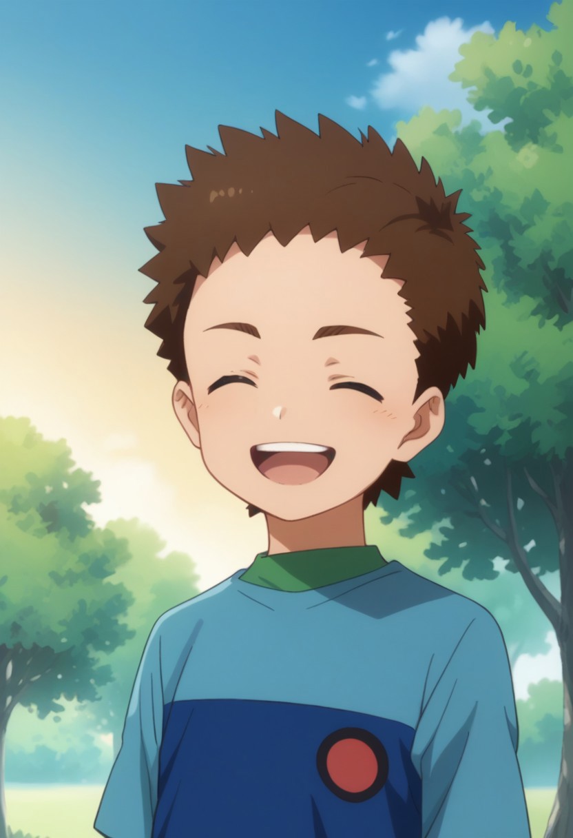 shou, 1boy, male focus, brown hair, solo, green eyes, shirt, long over short sleeves, blue shirt, green shirt, shorts,