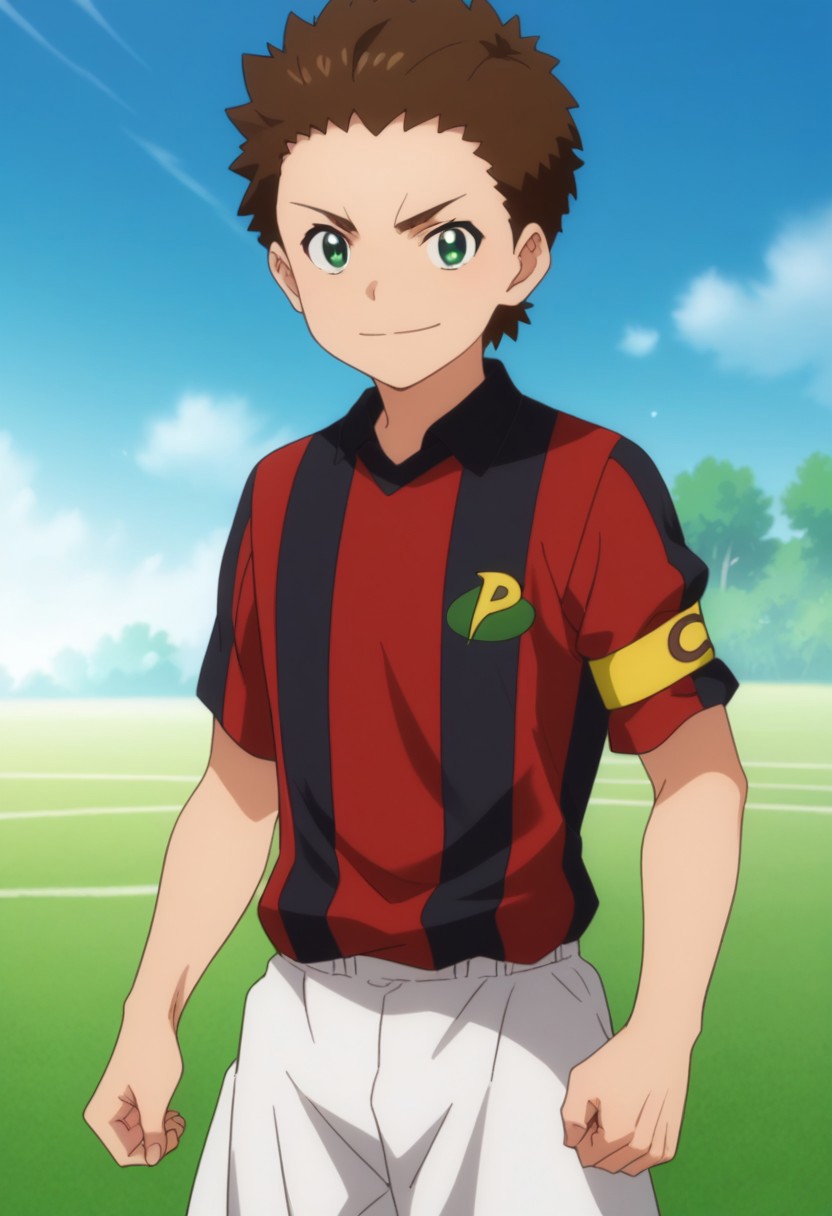 shou, 1boy, male focus, brown hair, solo, green eyes, shirt, sportswear, collared shirt, soccer uniform, striped, black shirt, red shirt, white shorts, armband, socks, shoes