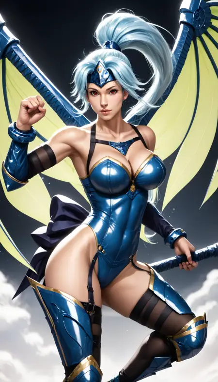 • Dragoonバージョン Meru 用のトリガー:Meru, 1girl, solo, blue hair, headband, blue bow, high ponytail, long hair, red eyes, bare shoulders, blue armor, breastplate, cleavage, sword, green wings, large wings, blue greaves, wristbands, gloves, shin guards heels, flying pose, in air, holding weapon, war hammer