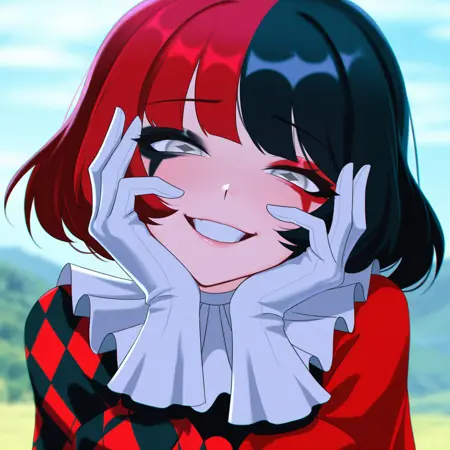 获取 Maf 的全部标签:Maf, 1girl, white gloves, gray eyes, frilled sleeves, rhombus-shaped pupils, split-color hair, red hair, black hair, two colors rhombic makeup, neck ruff, bob cut with blunt bangs, medium breasts, ruffled collar, two colors argyle sleeve, red sleeve, black romper, black pantyhose, solo