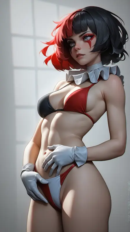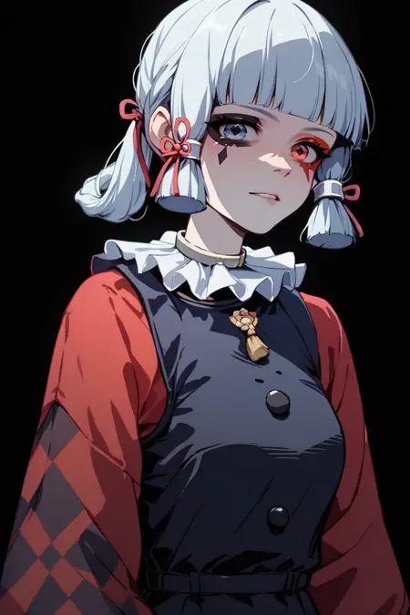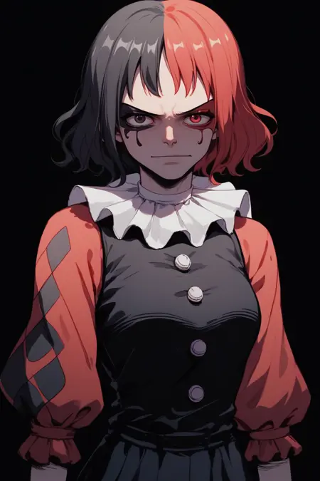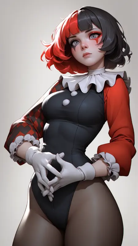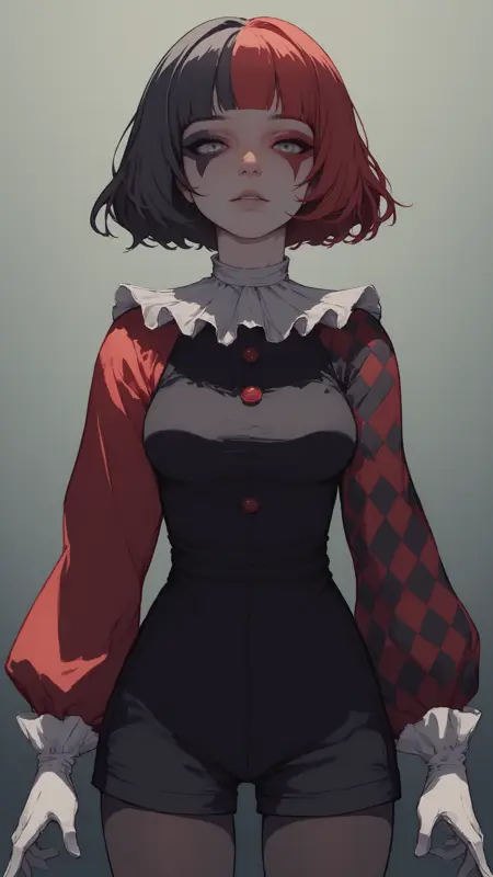 获取 Maf 的全部标签:Маф, 1girl, white gloves, grey eyes, frilled sleeves, rhombus-shaped pupils, split-color hair, red hair, black hair, two colors rhombic makeup, neck ruff, bob cut with blunt bangs, medium breasts, ruffled collar, two colors argyle sleeve, red sleeve, black romper, black pantyhose, solo