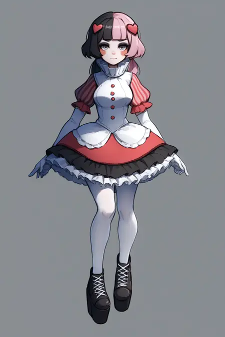 获取 Valentinka Maf 的全部标签:Valentinka_Maf, 1girl, white gloves, gray eyes, blush stickers, heart-shaped pupils, split-color hair, pink hair, black hair, eyeshadow, heart hair ornament, neck ruff, bob cut with blunt bangs, ruffled collar, striped sleeves, solo, dress, low twintails, puffy short sleeves, elbow gloves, short sleeves, white pantyhose, cross-laced footwear, platform footwear, white vest, black frilled skirt