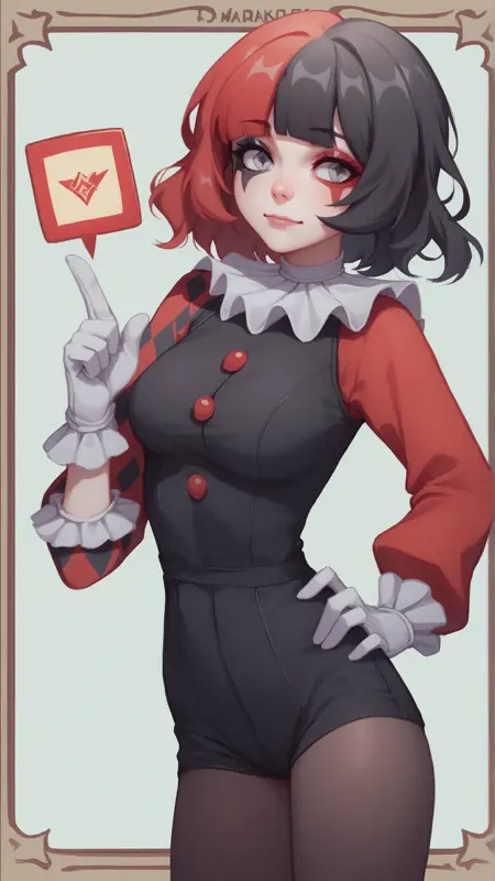 获取 Maf 的全部标签:Maf, 1girl, white gloves, gray eyes, frilled sleeves, rhombus-shaped pupils, split-color hair, red hair, black hair, two colors rhombic makeup, neck ruff, bob cut with blunt bangs, medium breasts, ruffled collar, two colors argyle sleeve, red sleeve, black romper, black pantyhose, solo