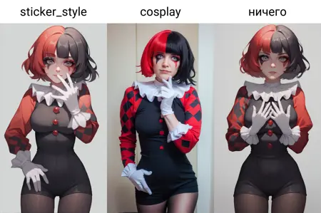style_sticker и cosplay - первый даёт рисовку стикера, второй реалистичную картинку. Стиль стикера может шакалить при разрешении больше 1024. Рекомендую попробовать добавить в негатив один из них.