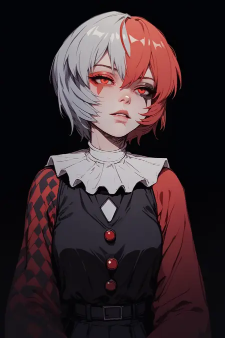 All tags for getting Maf - Маф, 1girl, white gloves, gray eyes, frilled sleeves, rhombus-shaped pupils, split-color hair, red hair, black hair, two colors rhombic makeup, neck ruff, bob cut with blunt bangs, medium breasts, ruffled collar, two colors argyle sleeve, red sleeve, black romper, black pantyhose, solo.