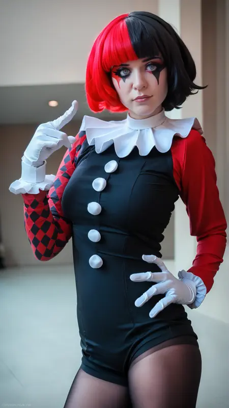 마프를 얻기 위한 모든 태그 - 마프, 1girl, white gloves, gray eyes, frilled sleeves, rhombus-shaped pupils, split-color hair, red hair, black hair, two colors rhombic makeup, neck ruff, bob cut with blunt bangs, medium breasts, ruffled collar, two colors argyle sleeve, red sleeve, black romper, black pantyhose, solo