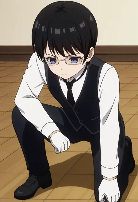 hayasaka, 1boy, black hair, short hair, blue eyes, glasses, white shirt, black vest, black pants, necktie, long sleeves, gloves