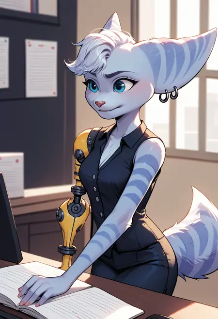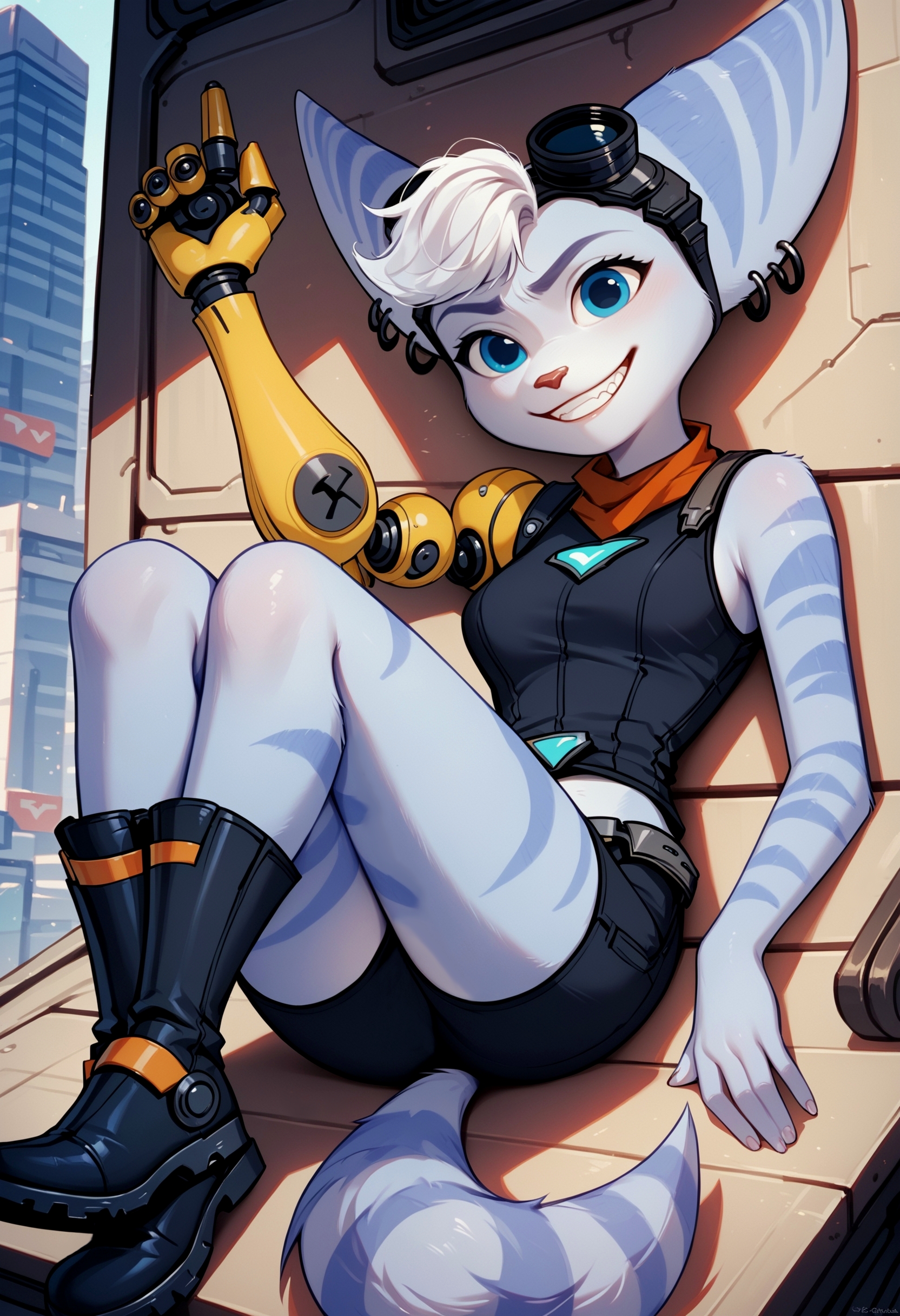 (양성 프롬프트) rivet, rivet \(ratchet & clank\), mohawk, white hair, blue eyes, single mechanical arm, animal ears, furry female, blue fur, striped fur,