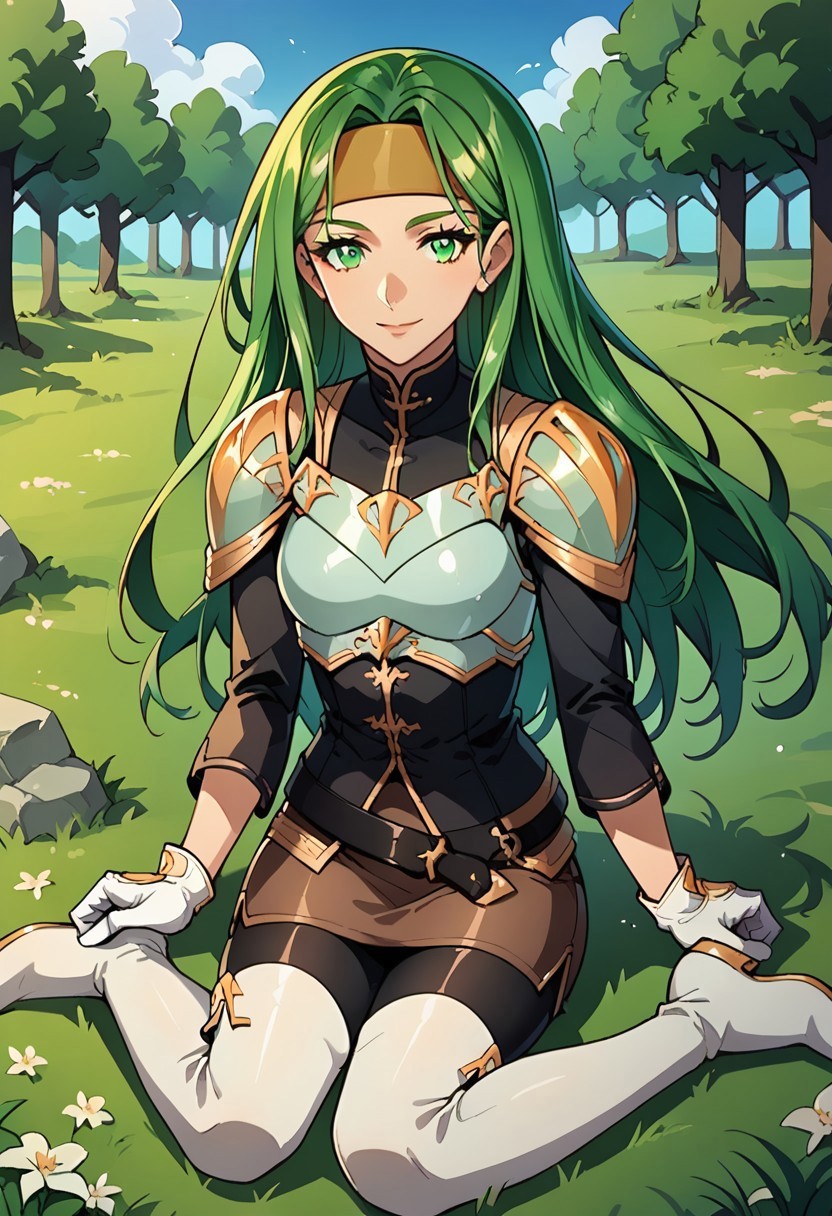 일반 프롬프트: SyFE, 녹색 머리, 긴 머리, 녹색 눈, 주황색 머리띠, 터틀넥, 가슴판, 어깨 방어구, 황금 테두리, 검은 셔츠, 긴 소매, 흰장갑, 갈색 치마, 검은 벨트, 검은 팬티스타킹, 흰 허벅지 부츠, 이색 신발,