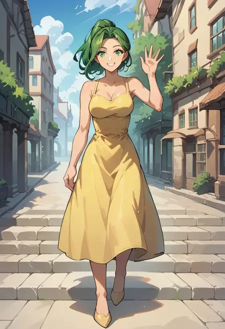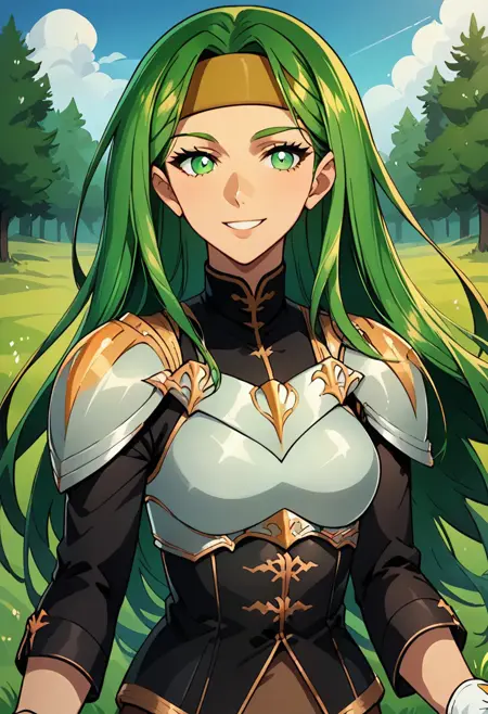 일반 프롬프트: SyFE, 녹색 머리, 긴 머리, 녹색 눈, 주황색 머리띠, 터틀넥, 가슴판, 어깨 방어구, 황금 테두리, 검은 셔츠, 긴 소매, 흰장갑, 갈색 치마, 검은 벨트, 검은 팬티스타킹, 흰 허벅지 부츠, 이색 신발,