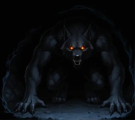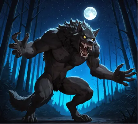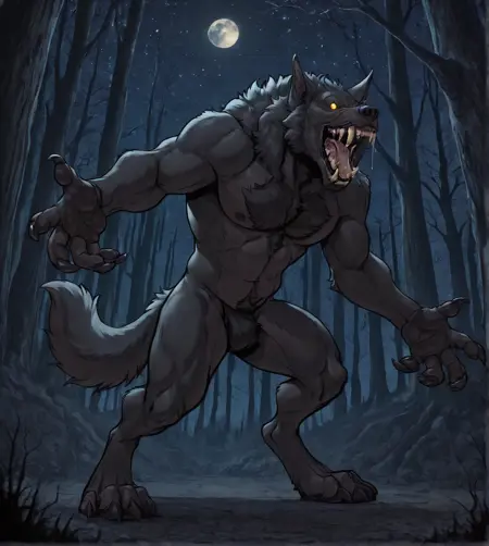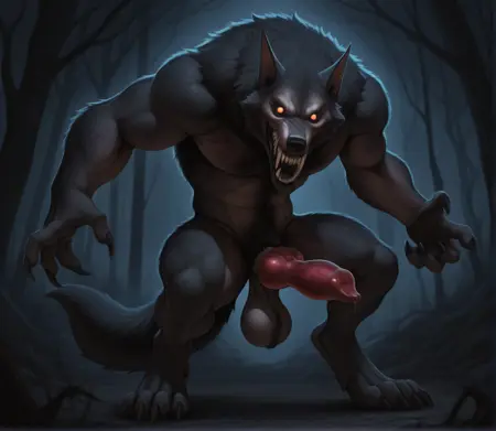 タグ:w3rewolf、werewolf、monster、scary、horror、muscular、sharp teeth、black sclera、claws、digitgrade、tail、mottled skin、black fur など...