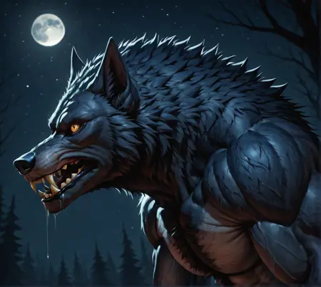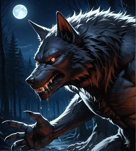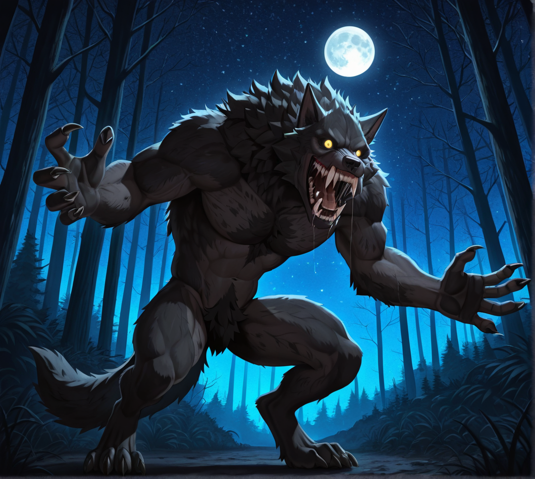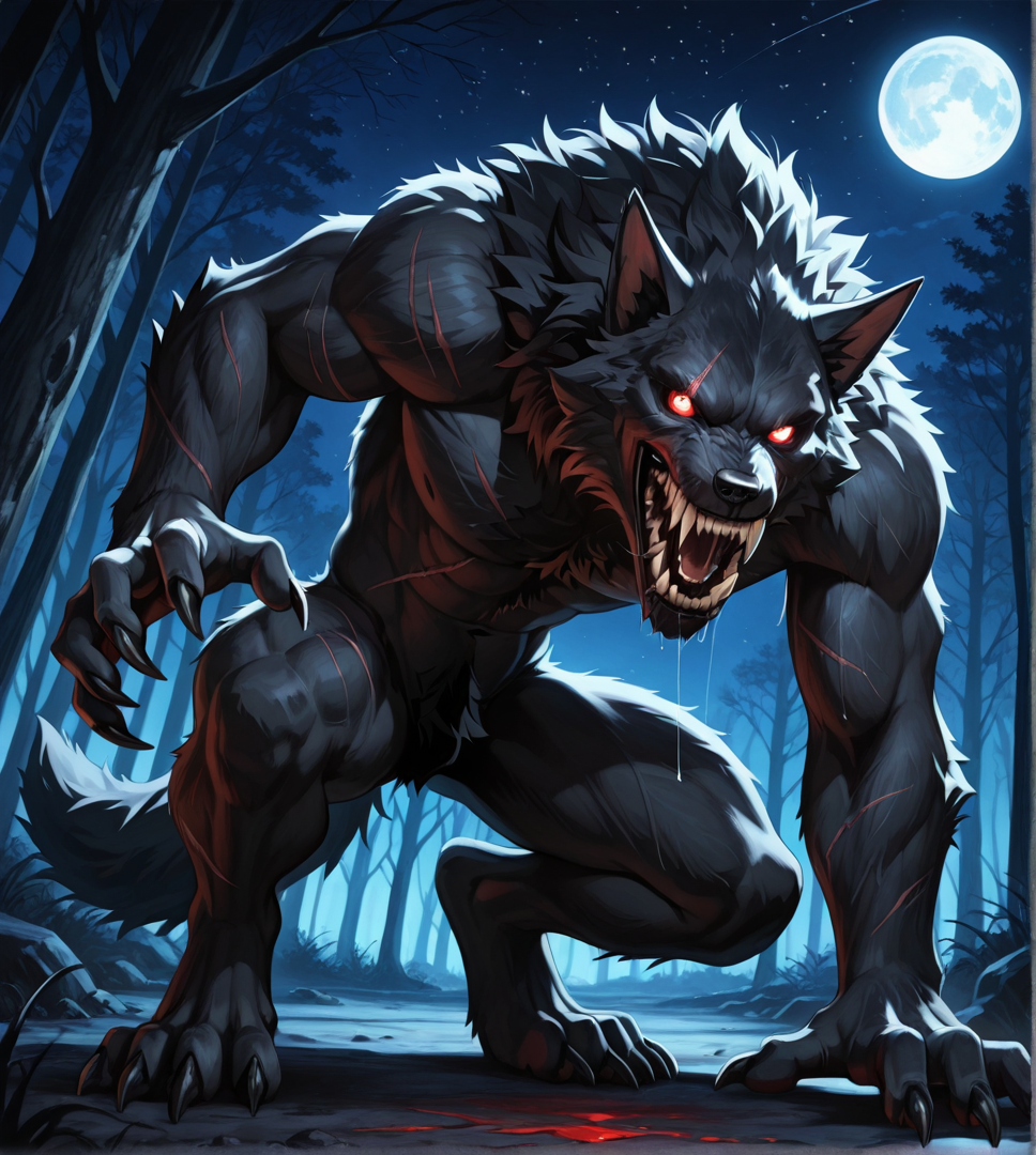 태그: w3rewolf, werewolf, monster, scary, horror, muscular, sharp teeth, black scelra, claws, digitgrade, tail, mottled skin, black fur, 등...