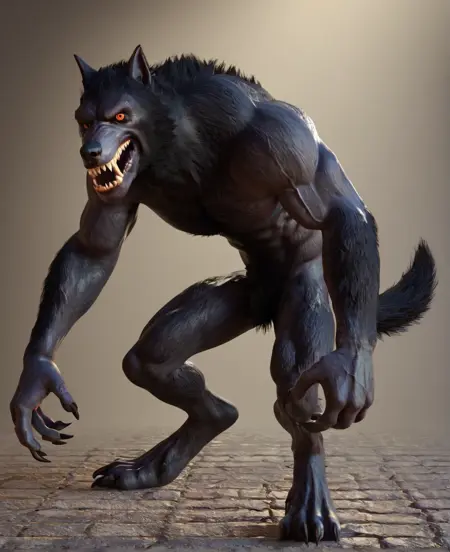 タグ:w3rewolf、werewolf、monster、scary、horror、muscular、sharp teeth、black sclera、claws、digitgrade、tail、mottled skin、black fur など...