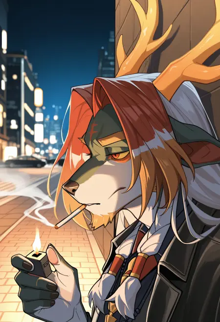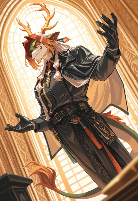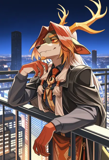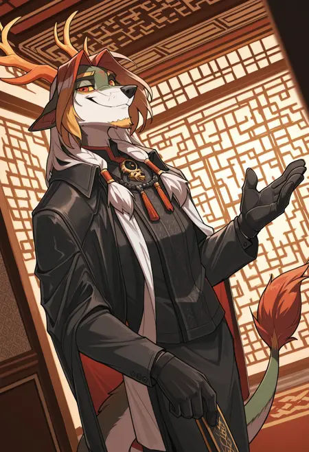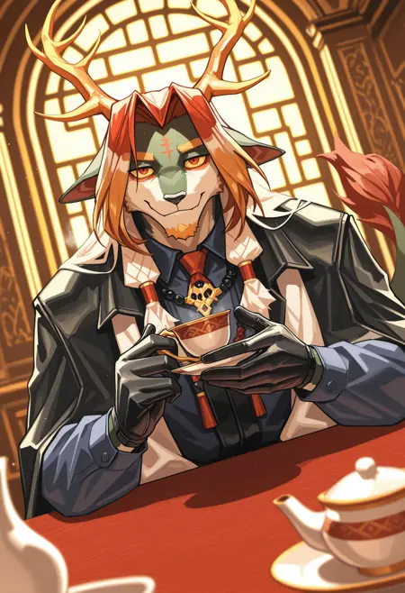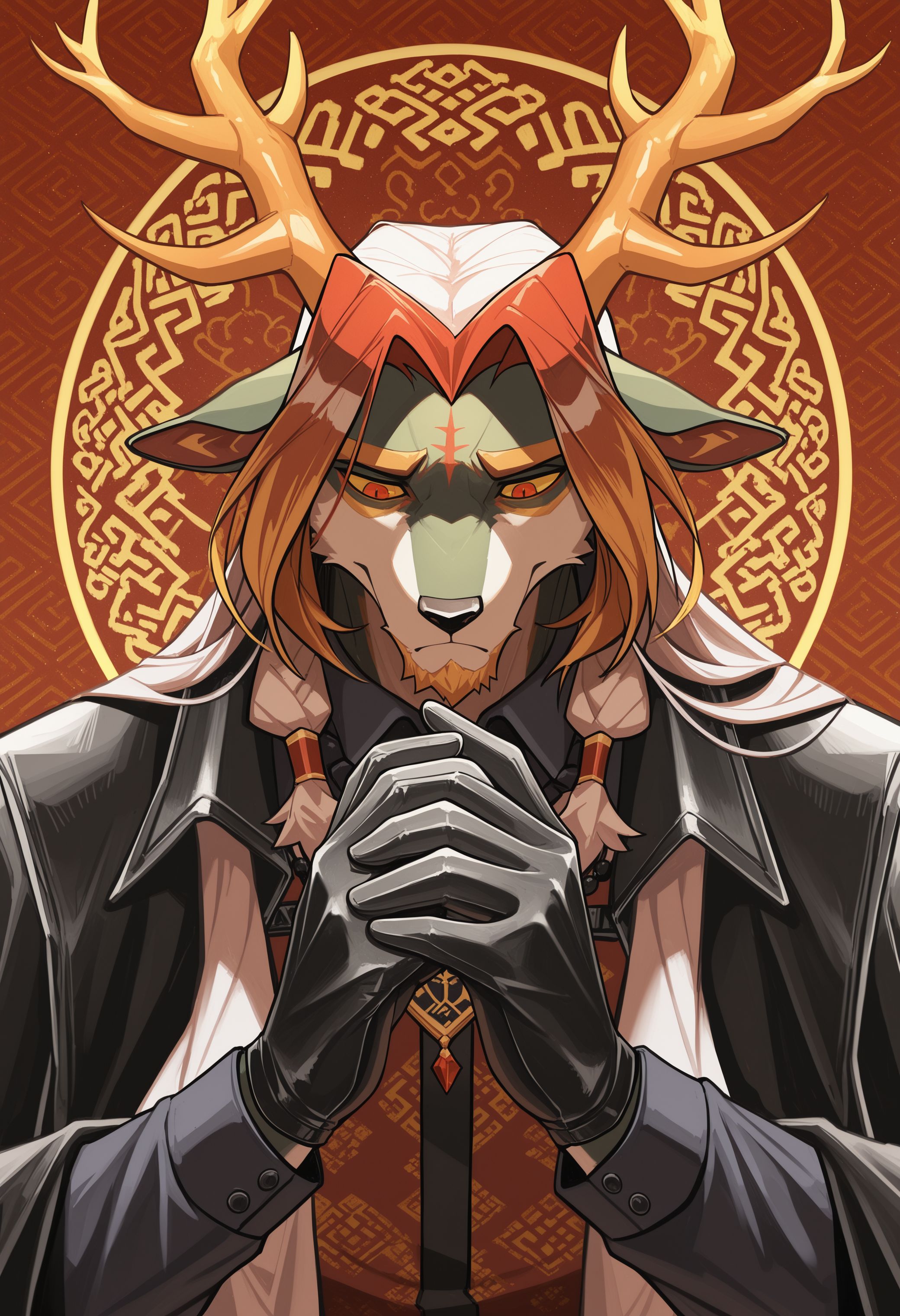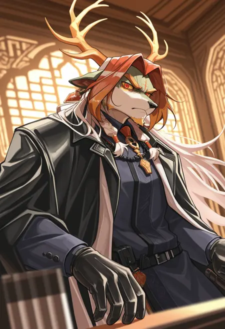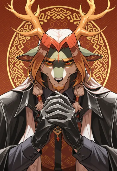 Illustrious: best quality, amazing quality, very aesthetic, absurdres, newest, wei yenwu, chief_executive_of_lungmen, 1boy, solo, furry male, red eyes, yellow sclera, furry, antlers, facial hair, ...your tags...