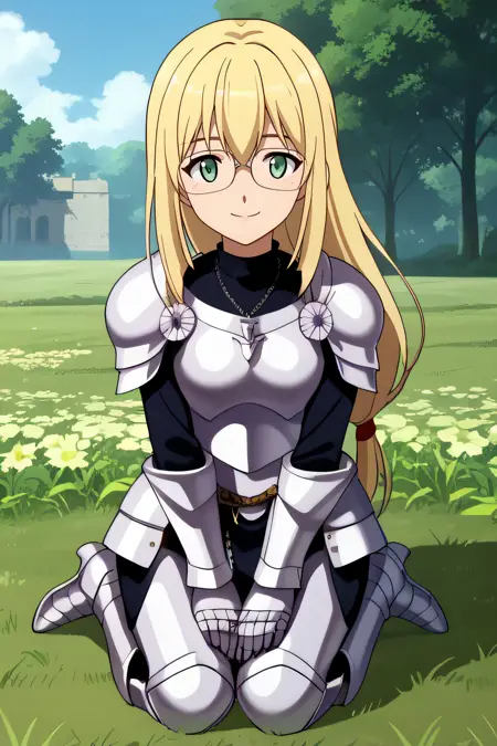 eanne, blonde hair, green eyes, glasses, necklace, armor, gauntlets, breastplate, knight, sheath, chainmail, armored boots, greaves