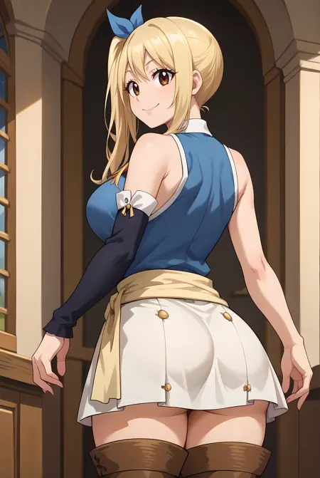 lucy heartfilia, blonde hair, long hair, side ponytail, brown eyes, blue sleeveless shirt, white sash, white skirt, black detached sleeve, brown thigh boots, smile,