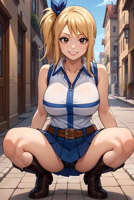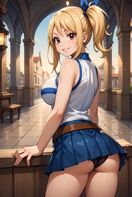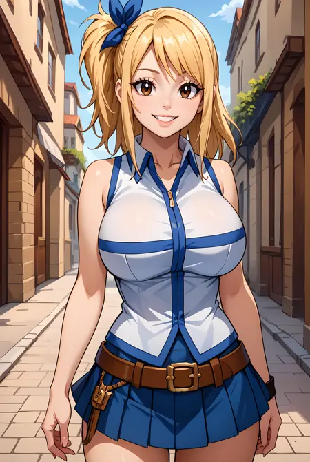 lucy heartfilia, brown eyes, blonde hair, single side ponytail, blue hair ribbon, sleeveless white shirt, blue collar, blue accents, short pleated blue skirt, brown belt, smile,