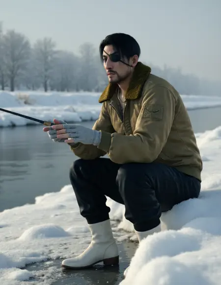 Infinite Wealth에서의 어부 복장은 어지러운 머리, 어지러운 수염과 콧수염, 검은 눈가리개/뱀 무늬 눈가리개, 금사슬 목걸이, 모피 턱받이가 달린 갈색 재킷, 흰색 손가락 없는 장갑, 검은 넉넉한 바지 및 흰색 부츠를 사용하세요.