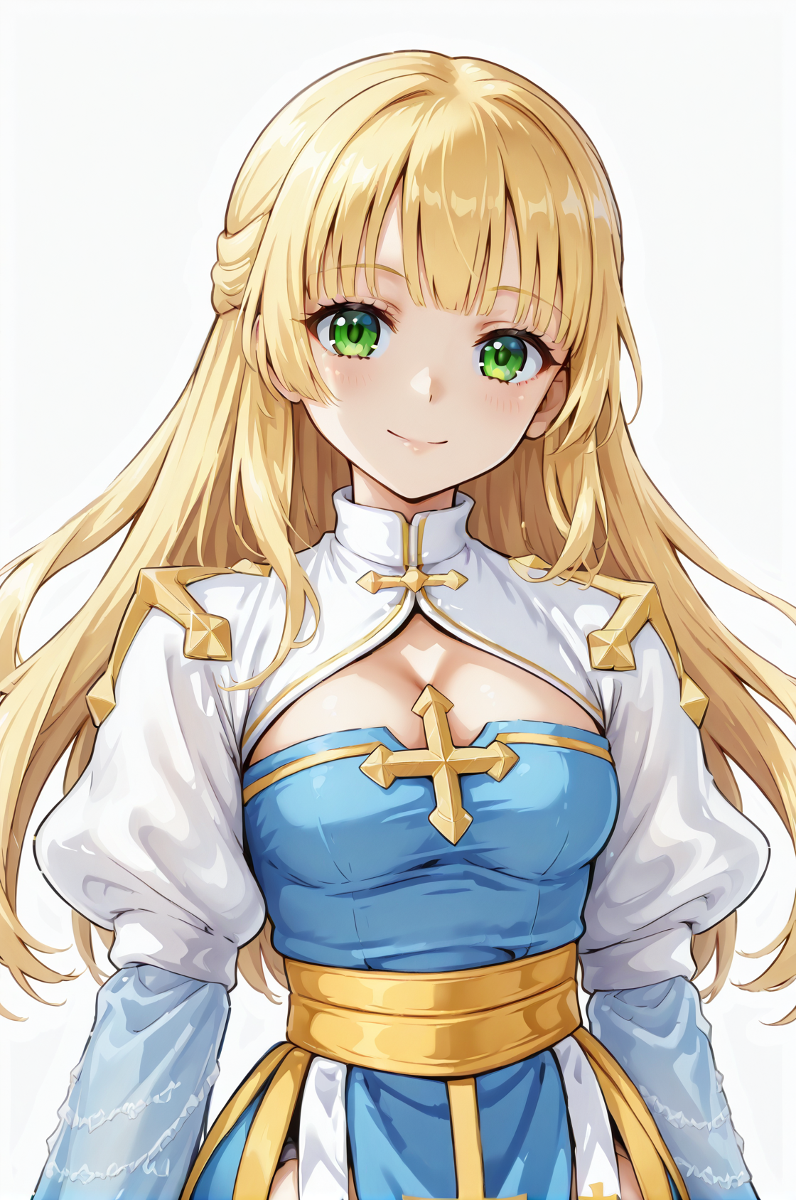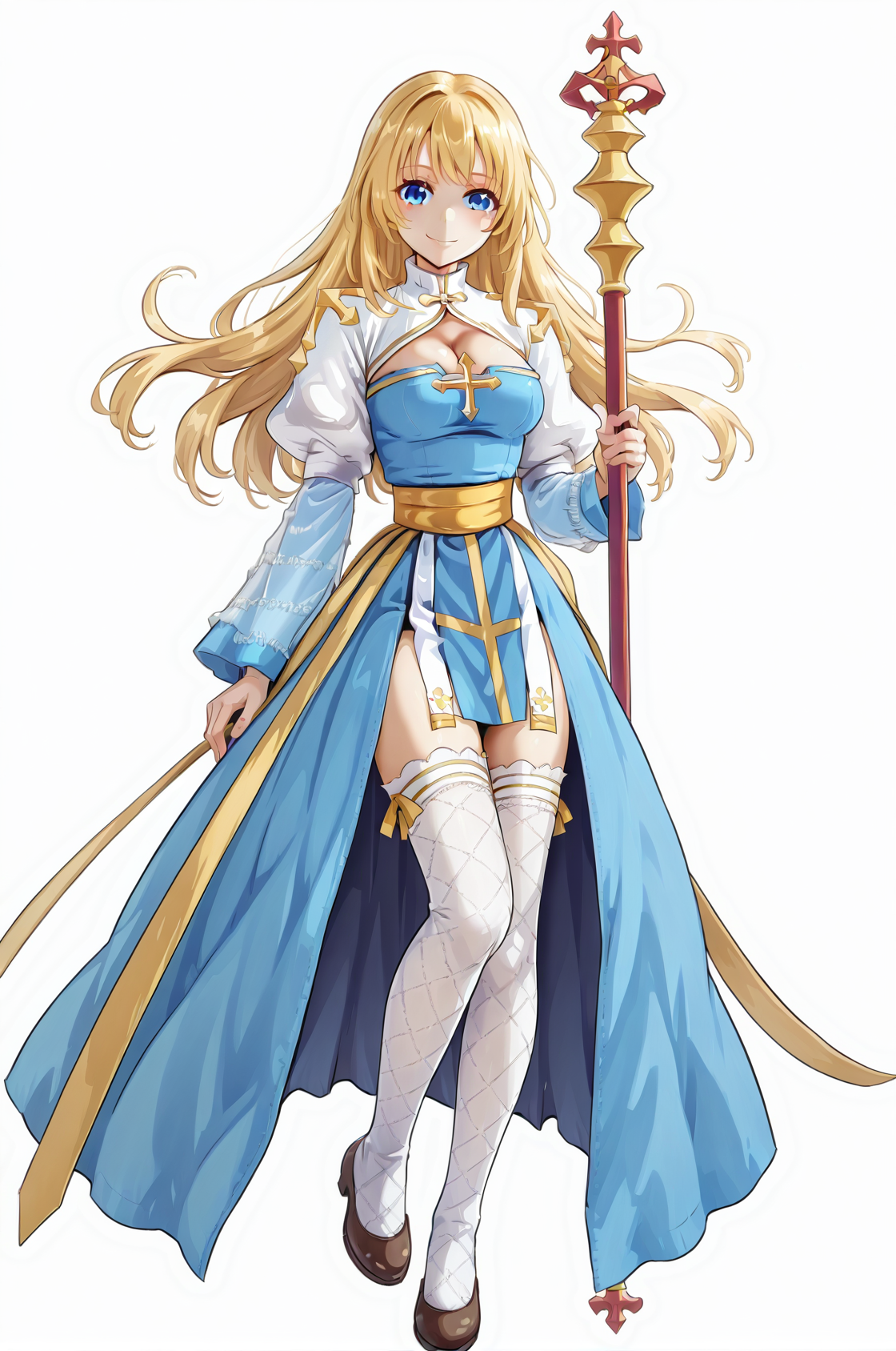 프롬프트: bishopRO, 흰색 허벅지 양말, 피쉬넷 팬티스타킹, 긴 소매, 파란색 드레스, 풍성한 소매, 가슴 부분 절개, 옆 슬릿, 보석, 십자가, 쉬르그(옷), 노란색 띠