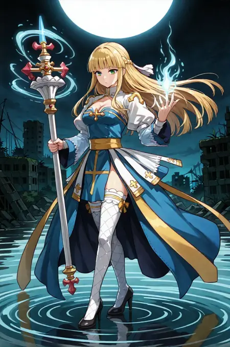提示词:bishopRO,白色过膝袜,渔网袜,长袖,蓝色连衣裙,蓬松袖子,露胸开口,侧边开衩,珠宝,十字架,披肩(服饰),黄色腰带