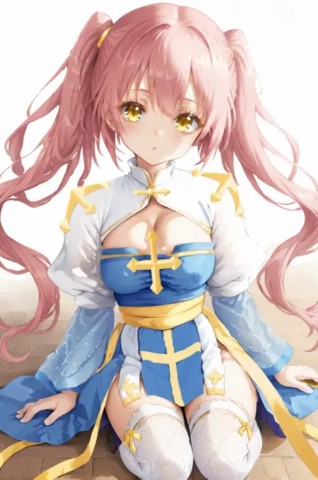 プロンプト:bishopRO、白いスパッツ、フィッシュネットレッグウェア、ロングスリーブ、青いドレス、ふわふわの袖、胸元の切り替え、サイドスリット、ジュエリー、十字架、ショール(衣類)、黄色い帯
